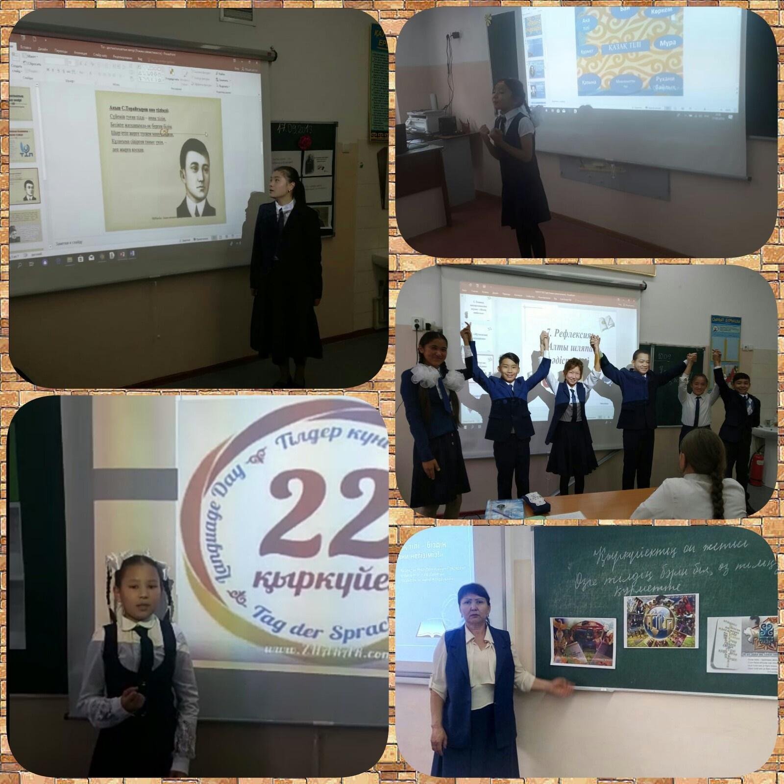 Мақсаты: Оқушыларға өз тіліміздің құдіретін, ұлтымыздың мақтанышы, айбаты екенін насихаттау, тіл -татулықтың, достықтың тетігі, тәрбиенің көзі, халықты біріктірудің маңызды фактор екенін өскелең ұрпаққа ұғындыру.