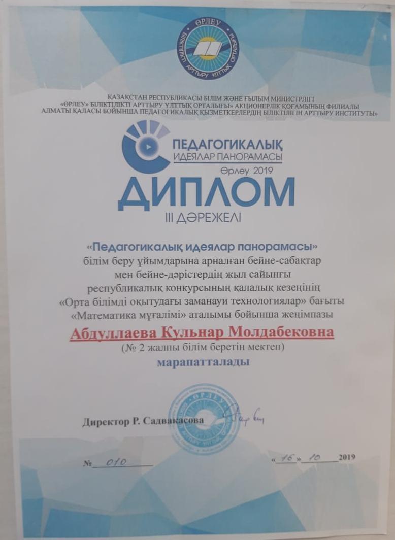 Жетісу ауданы #2 ЖББМ математика пәні мұғалімі Абдуллаева Кульнар Молдабековна "Педагогикалық идеялар панорамасы" білім беру ұйымдарына арналған бейне-сабақтар мен бейне-дәрістердің жыл сайынғы республикалық конкурсының қалалық кезеңінің "Орта білімді оқытудағы заманауи технологиялар" бағыты "Математика мұғалімі" аталымы бойынша ІІІ дәрежелі ДИПЛОМмен марапатталынды!