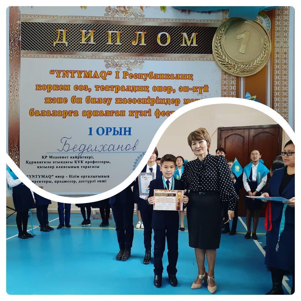 Жетісу ауданы #2 ЖББМ 7 сынып оқушысы БЕДЕЛХАНОВ ЕРФАТ "YNTYMAG" I Республикалық көркем сөз, театралдық өнер, ән күй және би билеу жасөспірімдер мен балаларға арналған күзгі фестиваліне қатысып І-ші орын иегері атанып ДИПЛОММЕН марапатталды!