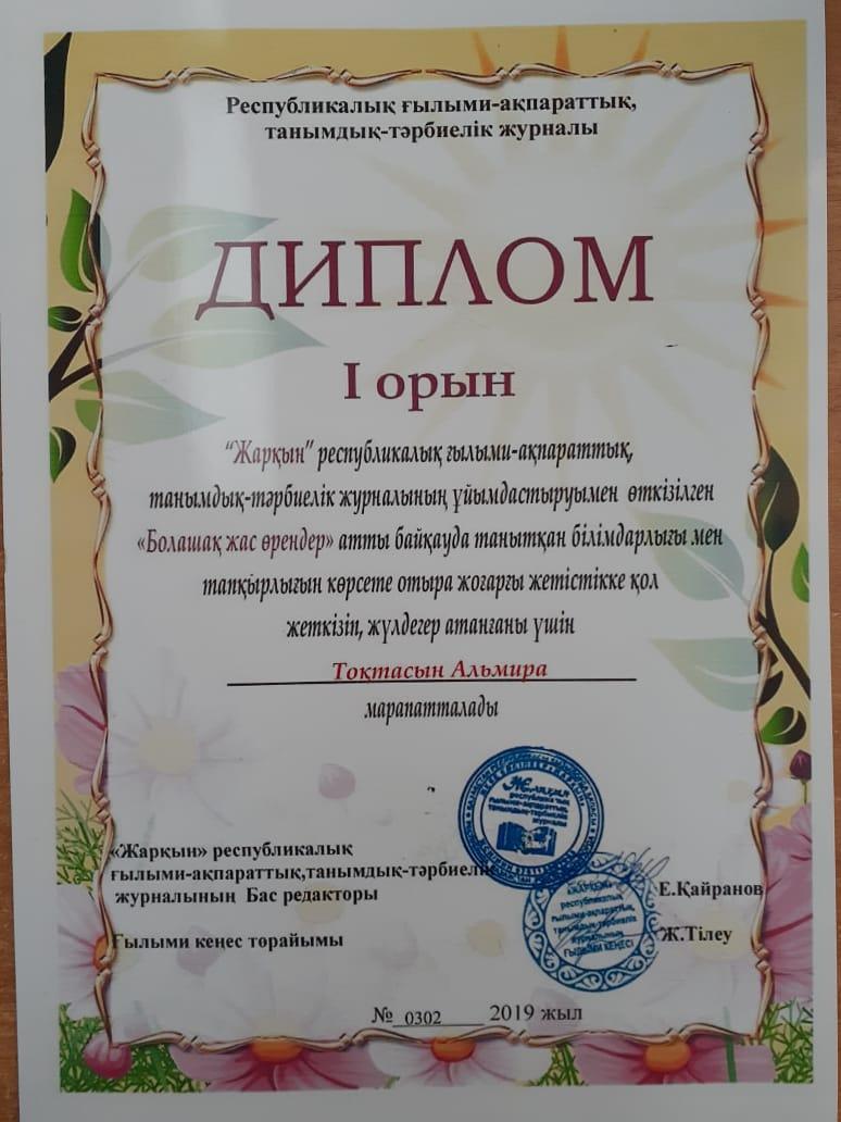 "Жарқын" республикалық ғылыми-ақпараттық, танымдық-тәрбиелік журналының ұйымдастыруымен өткізілген "Болашақ жас өрендер" атты байқауда танытқан білімдарлығы мен тапқырлығын көрсете отыра жоғарғы жетістікке қол жеткізіп, жүлдегер атанғаны үшін ТОҚТАСЫН АЛЬМИРА І орын ДИПЛОММЕН марапатталады.