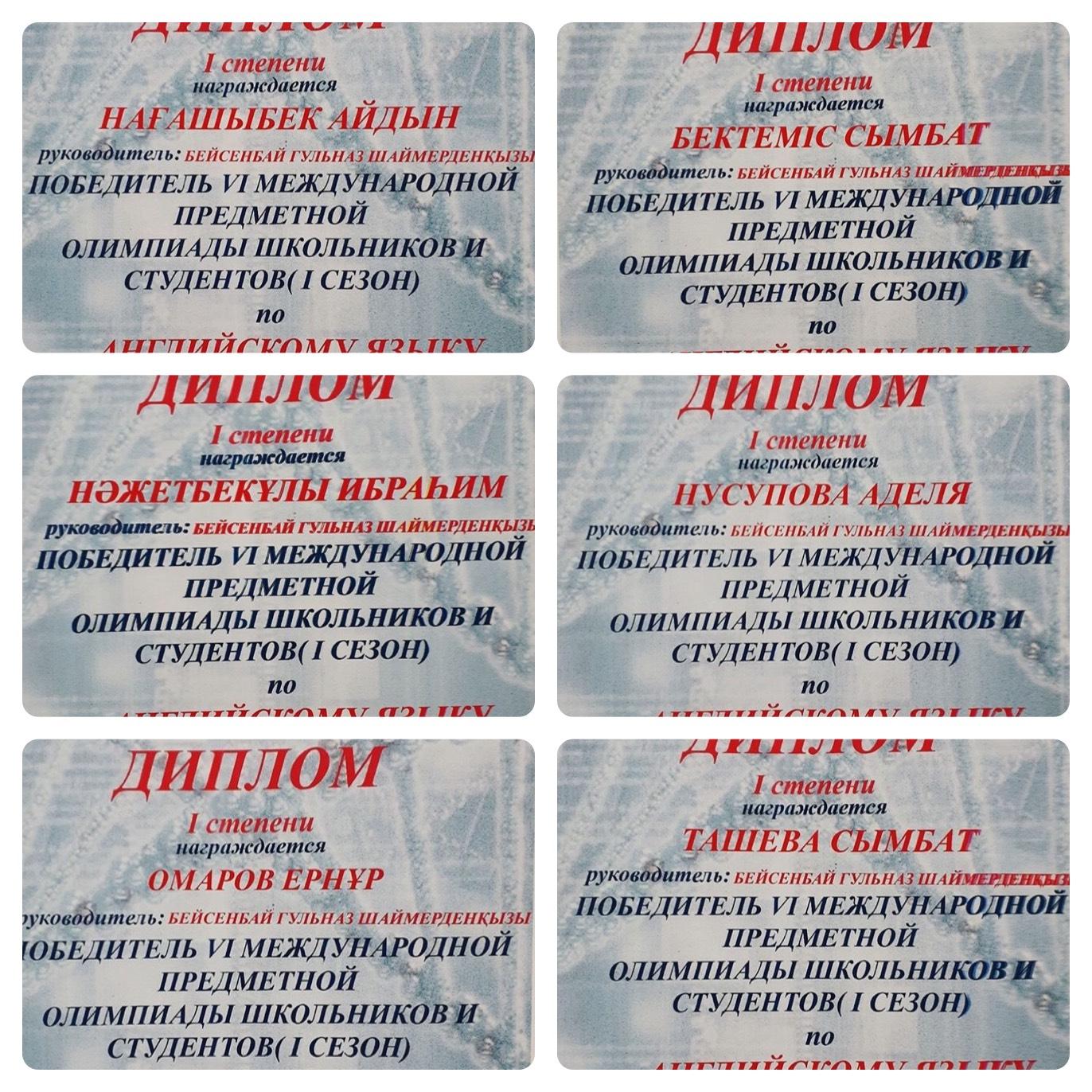 VI Халықаралық пәндік Олимпиададан ағылшын тілінен қатысып І дәрежелі ДИПЛОММЕН МАРАПАТТАЛДЫ! Жетекшісі: Бейсенбай Гүлназ Шаймерденқызы.