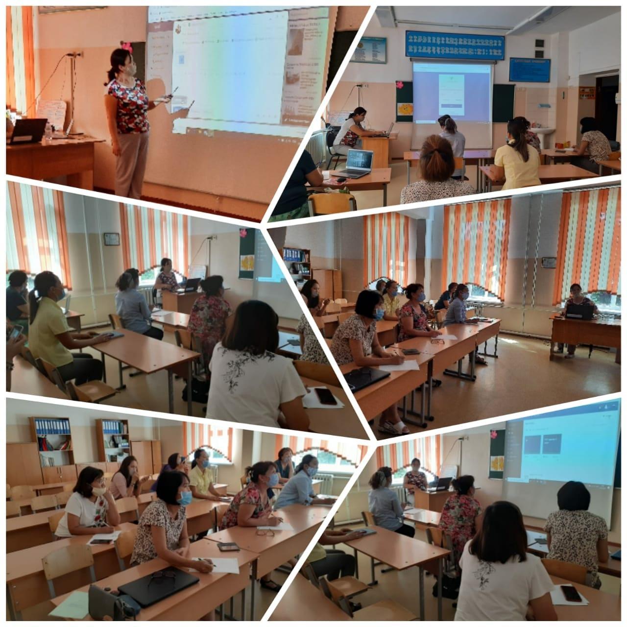 Жетісу ауданы #2 ЖББ мектептің информатика пәні мұғалімі Омарова Гүлназ Мархаббатқызы мектеп мұғалімдерімен қашықтықтан оқытуды ұйымдастыру жүйесі бойынша сабақ дайындау, онлайн сабақ өткізу сервисі, әр түрлі ресурстармен жұмыс істеу тәртібімен санитарлық-эпидемиологиялық талаптарды сақтай отырып, 15 минуттық көлемінде шеберлік сағатын өткізді.