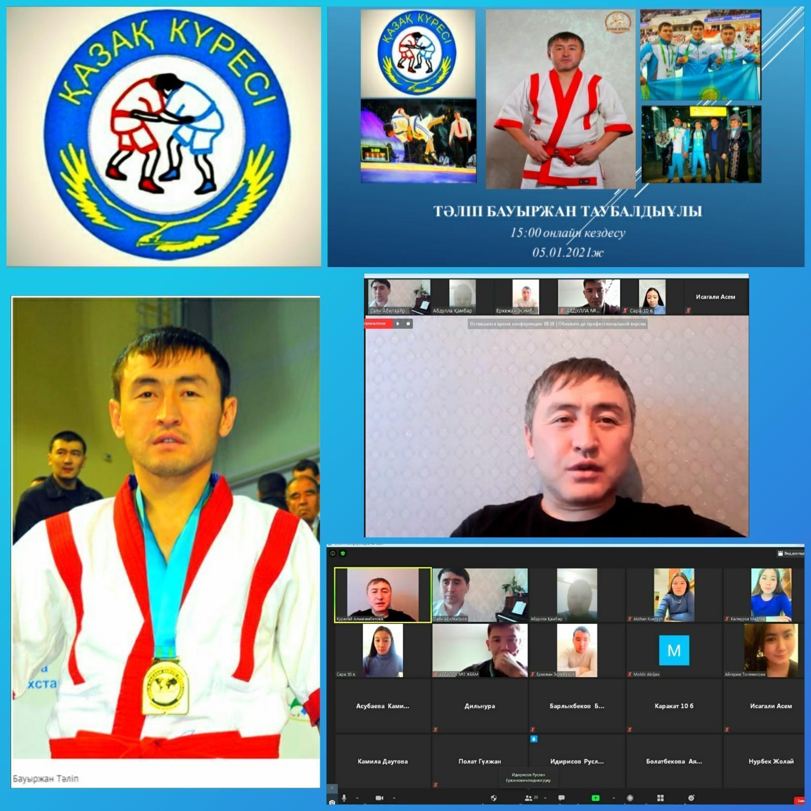 Жетісу аудандық Білім бөлімінің жоспарына сәйкес "Қазақстан балалары - қысқы ғажайып" қысқы каникул кезіндегі оқушылардың бос уақытын тиімді пайдалану мақсатында дене шынықтыру пәні мұғалімдері "Біз салауатты өмір салтын қорғаймыз" тақырыбында қазақ күресінен 2 дүркін Әлем чемпионы, 3 дүркін Азия чемпионы ТӘЛІП БАУЫРЖАН ТАУБАЛДЫҰЛЫМЕН онлайн кездесу өткізді.