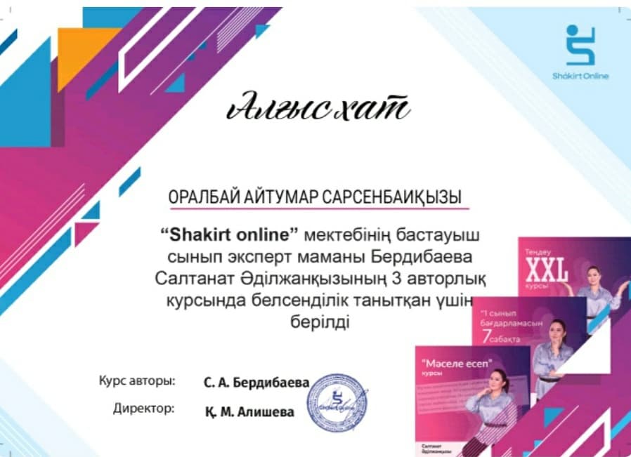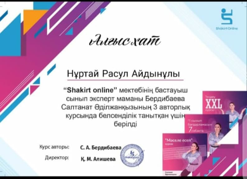 14 қаңтар 2021 0 1 2 3 4 5 Оқушы жетістіктері "Shakirt online" мектебіндегі маманның авторлық курсына бастауыш сынып оқушылары Оралбай Айтұмар, Хабибулла Ақылбек, Нұртай Расул қатысып Алғыс Хаттармен марапатталды.
