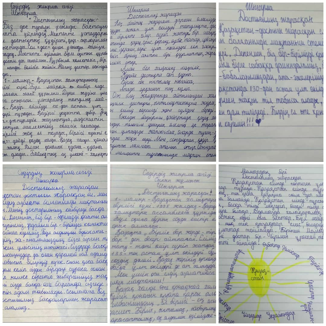 29 сәуір 2021 0 1 2 3 4 5 "Достығымыз жарасқан!" тақырыбында шығарма. Жетісу ауданы, Білім бөлімінің тапсырмасына сәйкес, 1 мамыр - Қазақстан халқының бірлігі күні қарсаңында "Достығымыз жарасқан!" тақырыбында 4 "А" сынып оқушылары шығарма жазды.