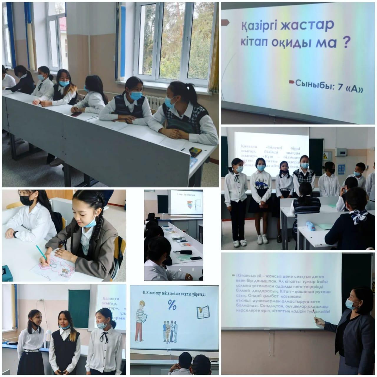 Ақпараттық технологияның қарқынды дамып отырған қазіргі заманында кез келген адамның әр түрлі салада, қалаған тақырыпта әр бағытта ақпаратпен хабардар болуына ешқандай кедергі жоқ екендігі еш шүбәсіз. Қазір тіпті, кітапты да интернет арқылы оқуға жағдай жасалған. Оқушылар «жанды кітап оқитындардың соңғы буыны біз бе?» , "жалпы қазіргі адамдар кітап оқуға құлшынысы қалай немесе оған уақыттары бар ма?" деген тақырыпта ойларын ортаға салып, талқылады.