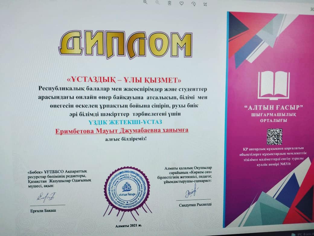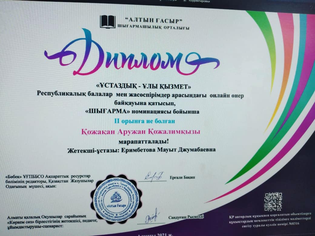 03 қараша 2021 0 1 2 3 4 5 "ҰСТАЗДЫҚ - ҰЛЫ ҚЫЗМЕТ" "ҰСТАЗДЫҚ - ҰЛЫ ҚЫЗМЕТ" Республикалық балалар мен жасөспірімдер арасындағы онлайн өнер байқауына "ШЫҒАРМА" номинациясы бойынша ІІ орынға ие болған ҚОЖАҚАН АРУЖАН ҚОЖАЛИМҚЫЗЫ марапатталады! Жетекші: ЕРИМБЕТОВА М.Д