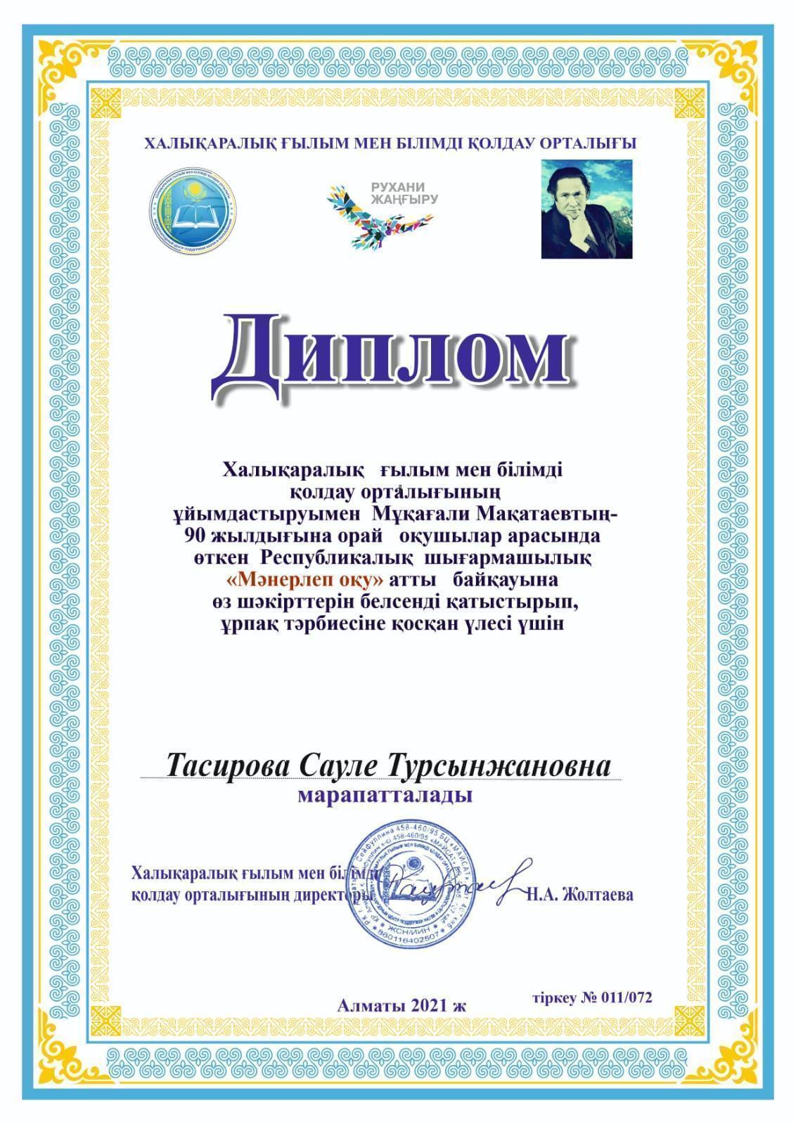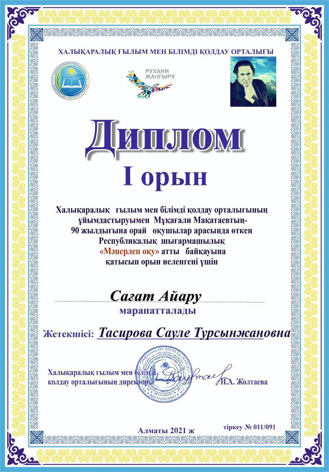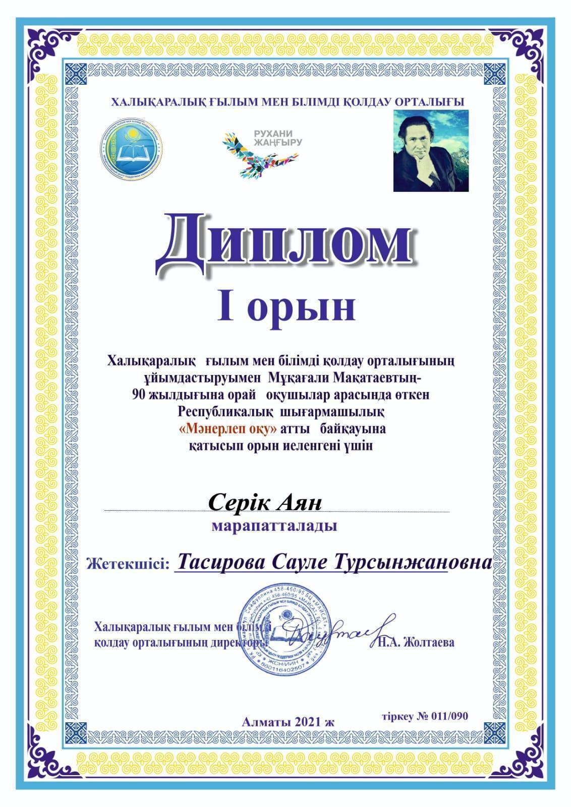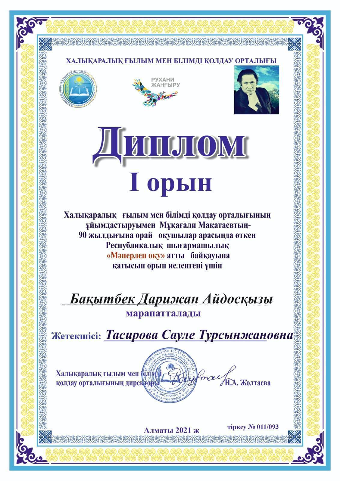 Халықаралық ғылым мен білімді қолдау орталығының ұйымдастыруымен Мұқағали Мақатаевтың 90 жылдығына орай оқушылар арасында өткен Республикалық шығармашылық "Мәнерлеп оқу" байқауына 1 "А" сынып оқушылары Сағат Айару, Талғат Алпамыс, Бақытбек Дарижан, Нұртай Айару, Пернехан Жасмин, Серік Аян қатысып І дәрежелі Дипломдармен марапатталды!!!