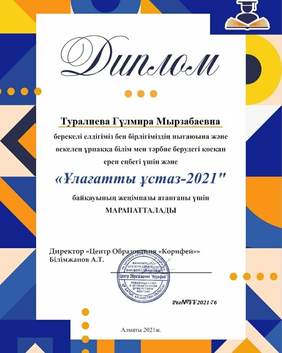 13 қаңтар 2022 0 1 2 3 4 5 «Ұлағатты ұстаз - 2021» Болашаққа бағдар - «Рухани Жаңғыру» бағдарламасы аясында өткізілген «Ұлағатты ұстаз - 2021» атты І Республикалық педагогикалық байқауына мектебіміздің қазақ тілі мен әдебиеті пәні мұғалімі ТУРАЛИЕВА Г.М қатысып, Дипломмен марапатталды. Құттықтаймыз!