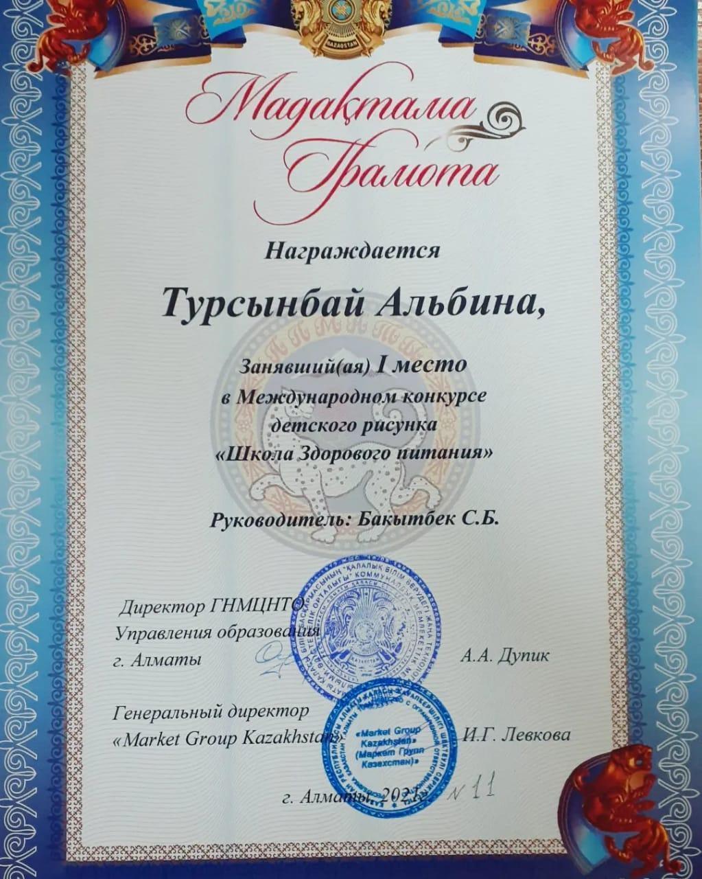 18 қаңтар 2022 0 1 2 3 4 5 Дипломмен марапатталды! "Дұрыс тамақтану мектебі" Халықаралық балалар шығармашылық байқауына 11 "А" сынып оқушысы ТҰРСЫНБАЙ АЛЬБИНА қатысып, І дәрежелі Дипломмен марапатталды!Жетекші: БАҚЫТБЕКҚЫЗЫ СӘНИЯ
