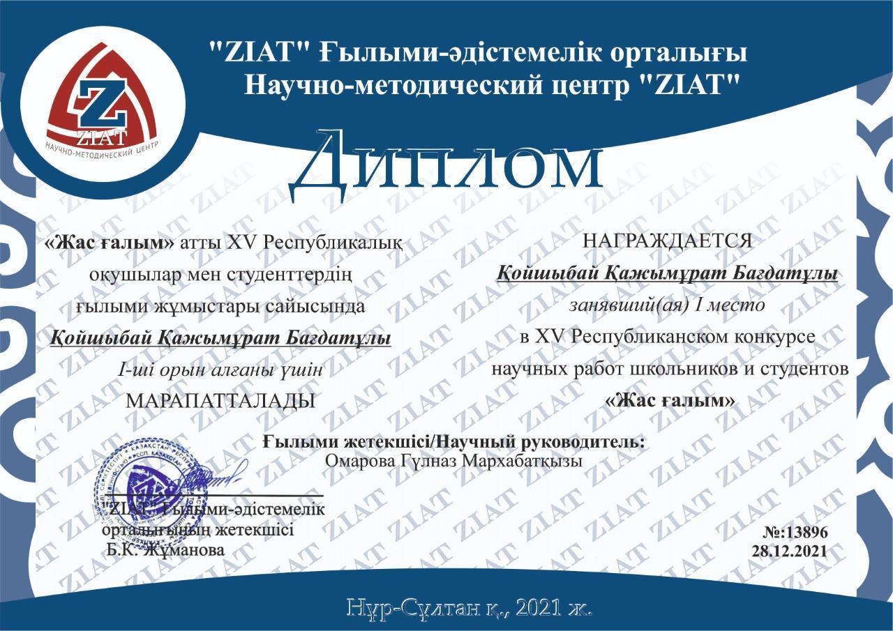 "ZIAT" ғылыми-әдістемелік орталығының ұйымдастыруымен өткен "ЖАС ҒАЛЫМ" XV Республикалық оқушылар мен студенттердің ғылыми жұмыстары сайысына 9 "А" сынып оқушылары Қойшыбай Қажымұрат пен Мұханбетқали Бақдаулет қатысып, І дәрежелі Дипломмен марапатталды!