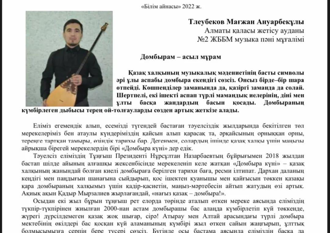 21 қаңтар 2022 0 1 2 3 4 5 "Домбырам -асыл мұрам" Республикалық "Білім айнасы" ғылыми-танымдық журналына мектебіміздің музыка пәні мұғалімі Тлеубеков М.А "Домбырам -асыл мұрам" атты мақаласы жарияланды.