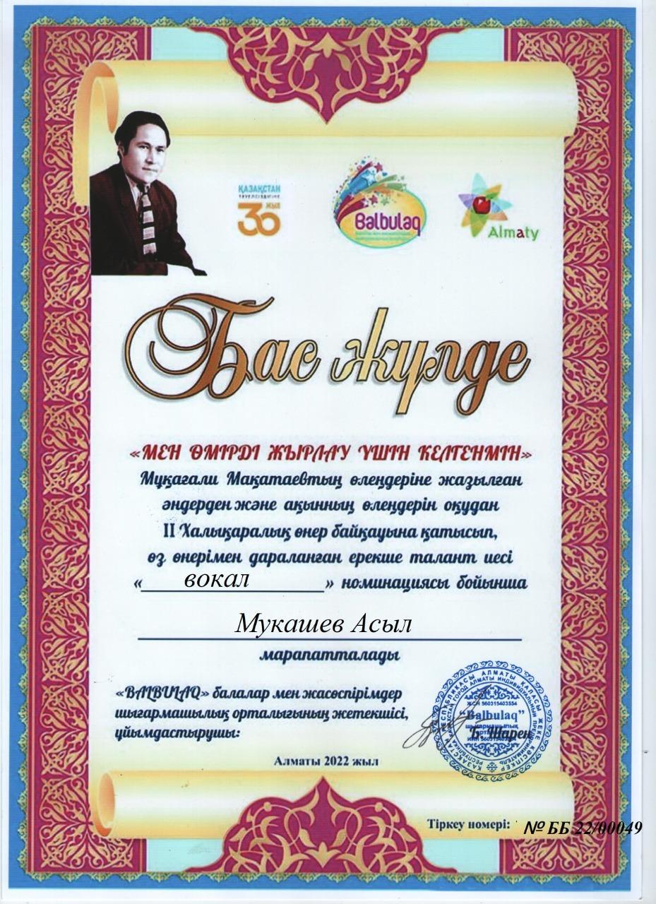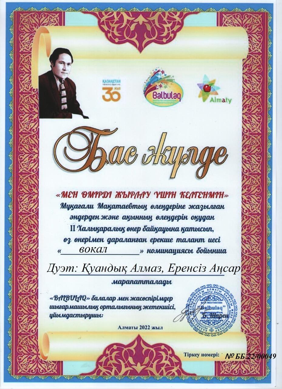 "Мен өмірді жырлау үшін келгенмін" Мұқағали Мақатаевтың өлеңдеріне жазылған әндерден және ақынның өлеңдерін оқудан ІІ Халықаралық өнер байқауына "вокал" номинациясы бойынша мектеп оқушылары ҚУАНДЫҚ АЛМАЗ, ЕРЕНСІЗ АҢСАР, БАЙМҰРЗА АЯЛА, МУКАШЕВ АСЫЛ қатысып "Бас Жүлдемен" марапатталды!