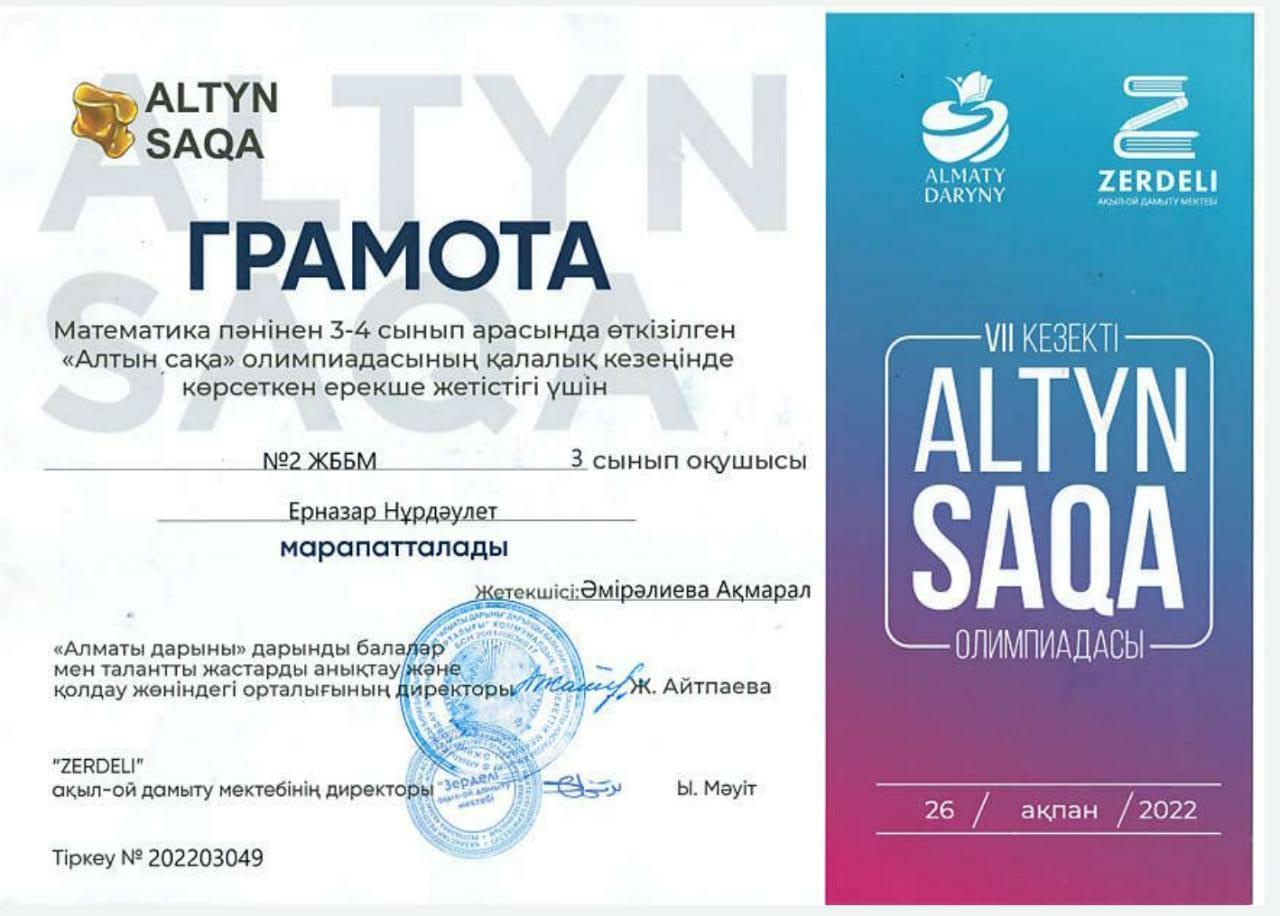 Алматы қаласы "Зерделі" ақыл-ой дамыту мектебінің ұйымдастыруымен 3-4 сынып оқушылары арасындағы математика пәнінен өткізілген "АЛТЫН САҚА" олимпиадасының қалалық кезеңіне көрсеткен ерекше жетістігі үшін 3 "А" сынып оқушысы Ерназар Нұрдаулет марапатталды.