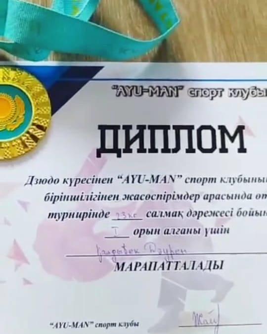Мектебіміздің 1 "Б" сынып оқушысы Қалдыбек Дәурен дзюдо күресінен "AYU-MAN" спорт клубының жасөспірімдер арасында өткізілген турниріне қатысып, І дәрежелі Дипломмен марапатталды