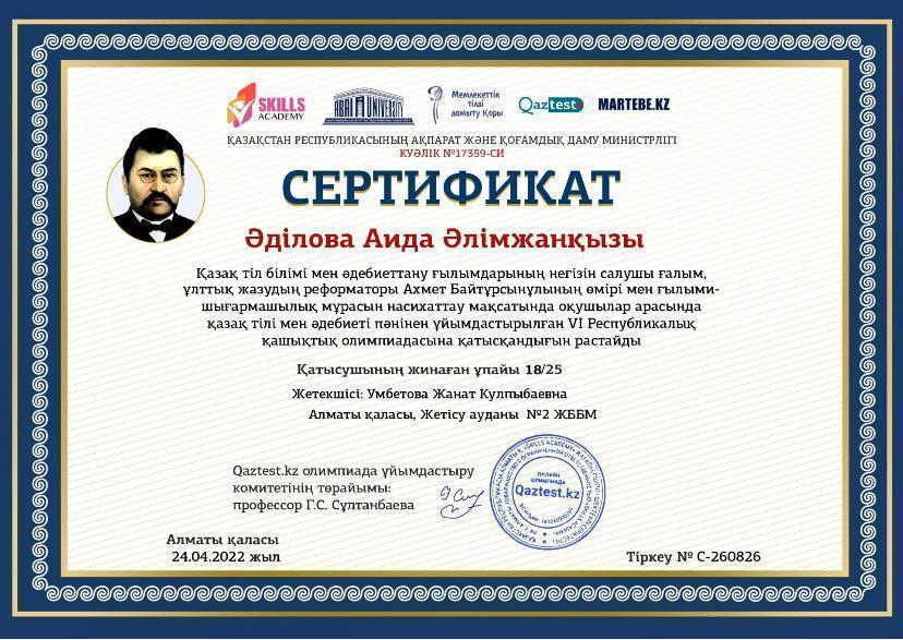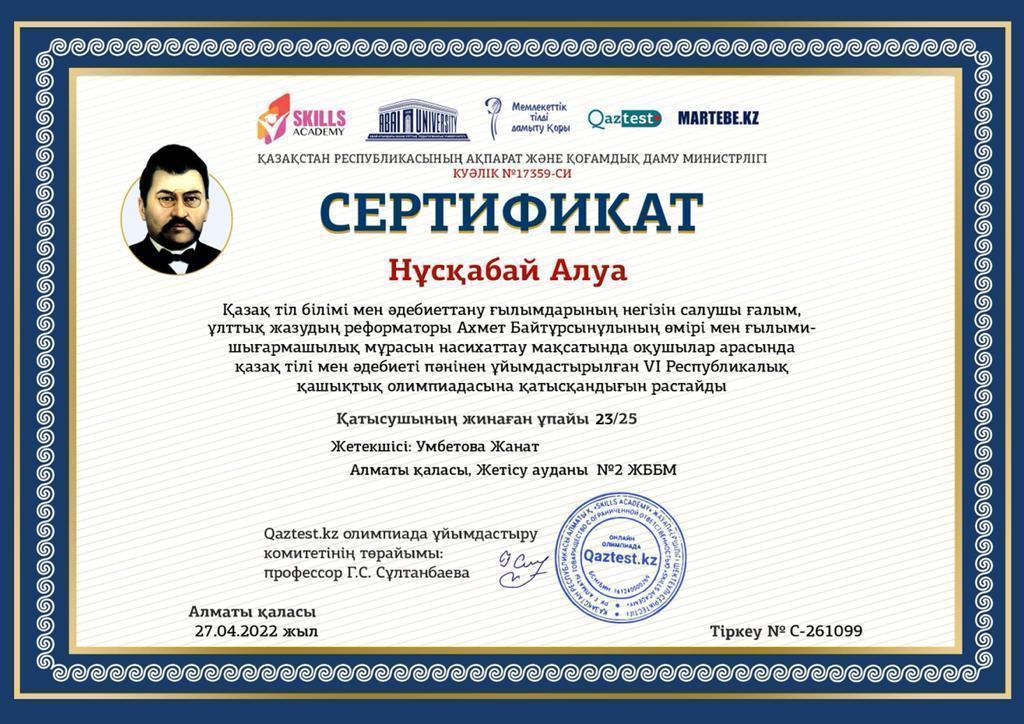 Қазақ тіл білімі мен әдебиеттану ғылымдарының негізін салушы ғалым, ұлттық жазудың рефарматоры Ахмет Байтұрсынұлының өмірі мен ғылыми-шығармашылық мұрасын насихаттау мақсатында оқушылар арасында қазақ тілі мен әдебиеті пәнінен ұйымдастырылған IV Республикалық қашықтық олимпиадасына мектебіміздің 9 "А" сынып оқушысы Әділова Аида қатысып ІІІ дәрежелі Дипломмен, 11 "А" сынып оқушысы Нұсқабай Алуа І дәрежелі Дипломмен марапатталды!