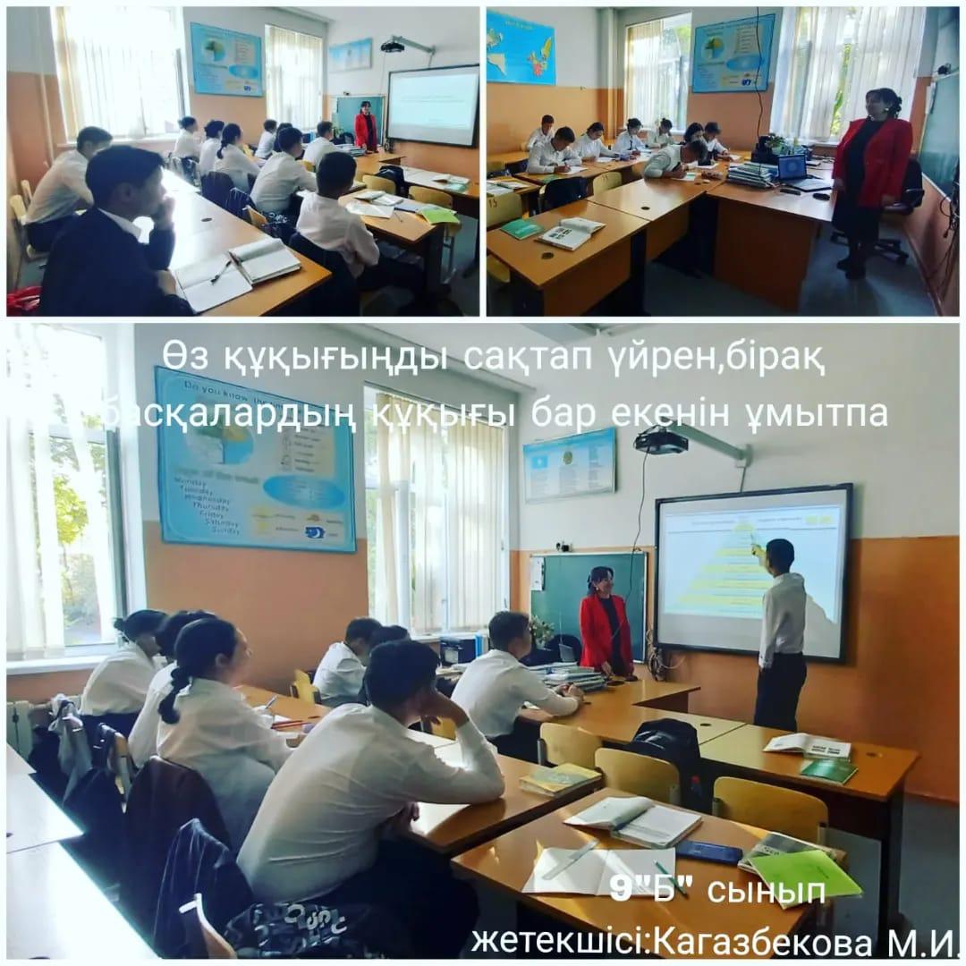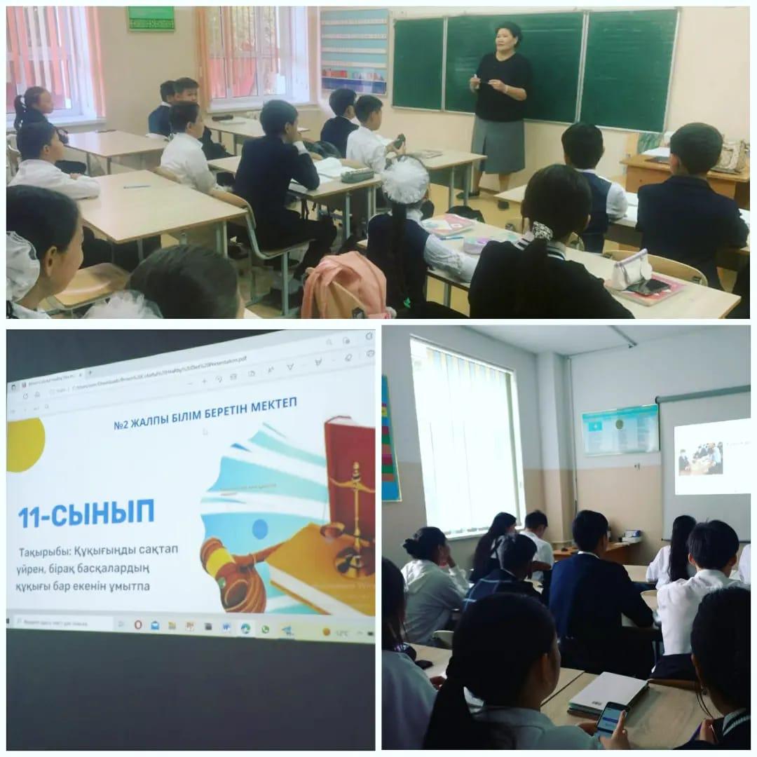 Жетісу ауданы, №2 ЖББМ 1-4 сынып оқушыларына "Менің Ата Заңым!", 5-7 сынып оқушыларына "Сақтансаң сақтайды, сақ бол", 8-11 сынып оқушыларына Өз құқығыңды сақтап үйрен, бірақ басқалардың құқығы бар екенін ұмытпа!" тақырыптарында тәрбие сағаттары өткізілді.