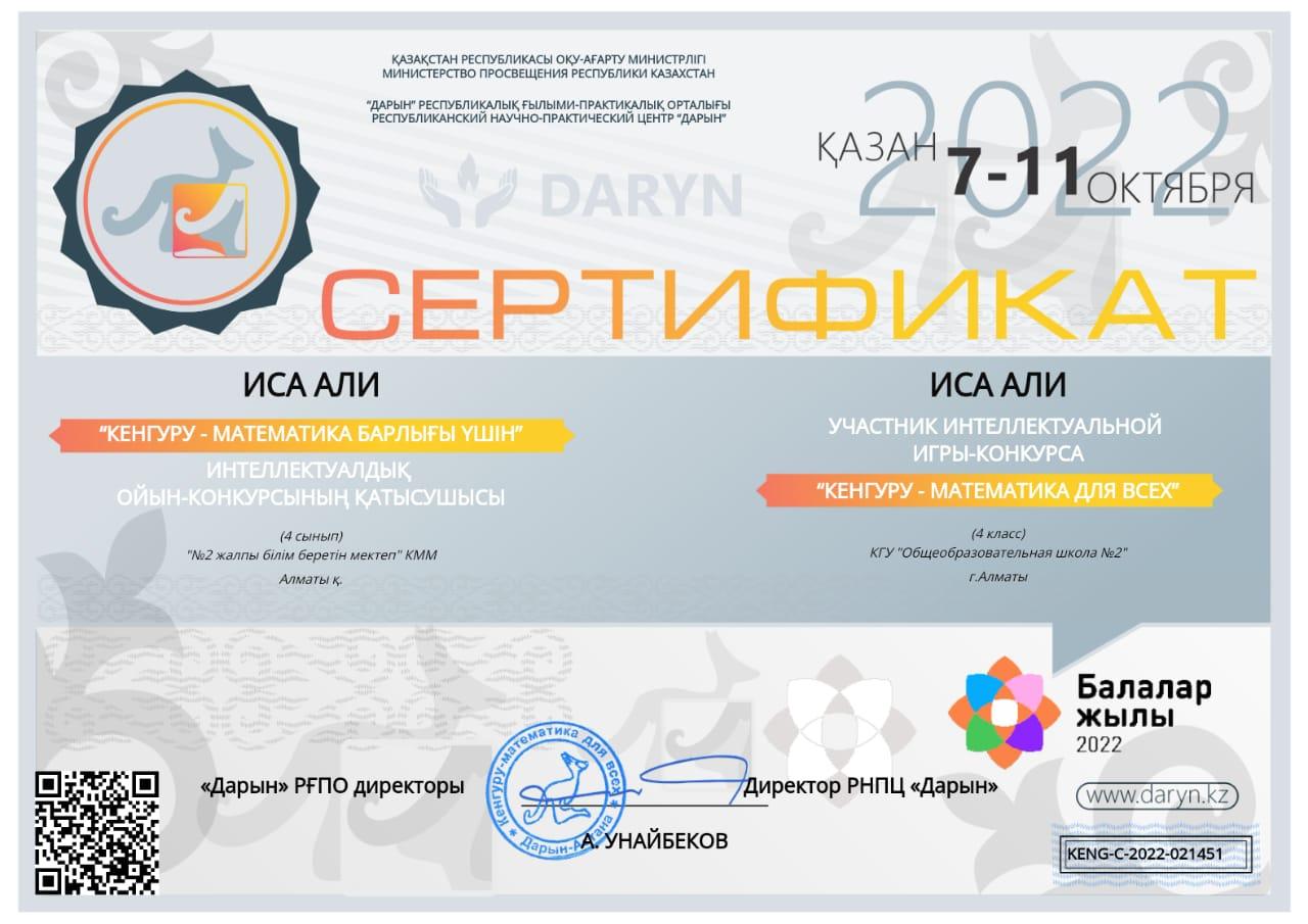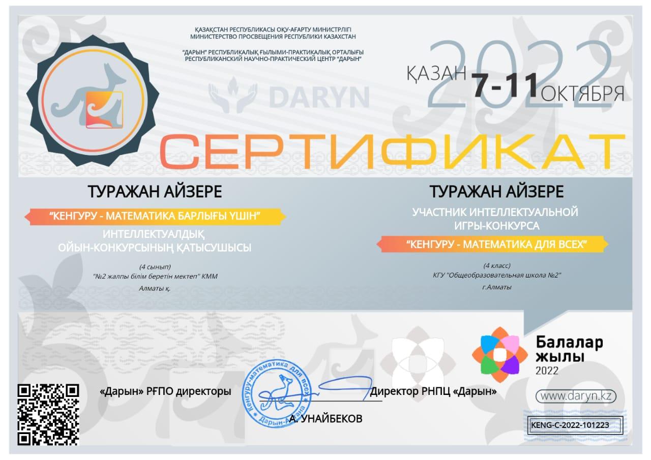 28 қазан 2022 0 1 2 3 4 5 "Кенгуру - математика барлығы үшін" Мектебіміздің 4 "Б" сынып оқушылары "Кенгуру - математика барлығы үшін" интеллектуалды ойын-конкурсына қатысып жеңімпаздар атанды.Сынып жетекші: Сарбасова Г.Қ