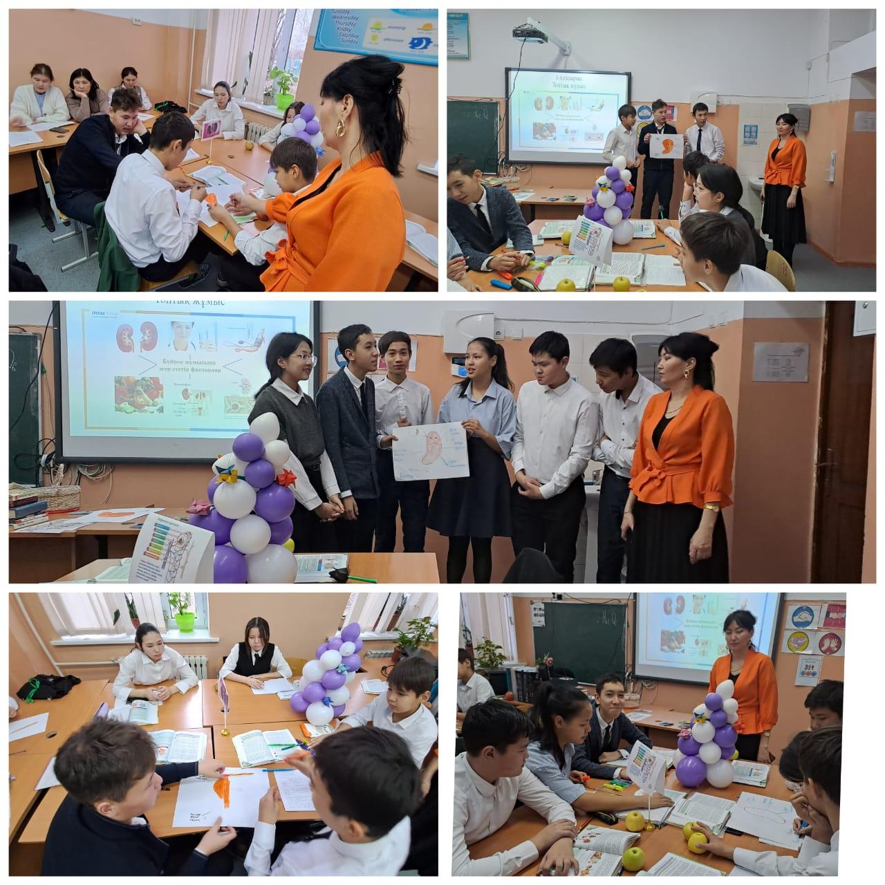 «Үштілділік – жаһандану заманының талабы» атты 21.11-29.11.2022 жыл аралығындағы жаратылыстану бағытындағы пәндер бірлестігінің апталығы аясында биология пәні мұғалімі Кагазбекова М.И 9 "Б" сынып оқушыларына "Бүйрек жұмысына әсер ететін факторлар" тақырыбында ашық сабақ өткізді.