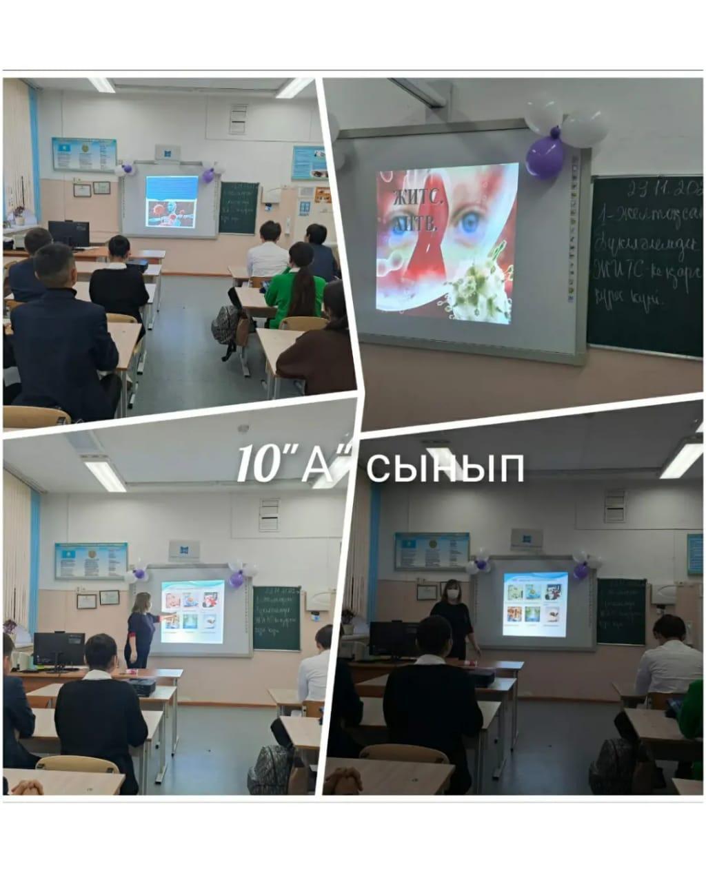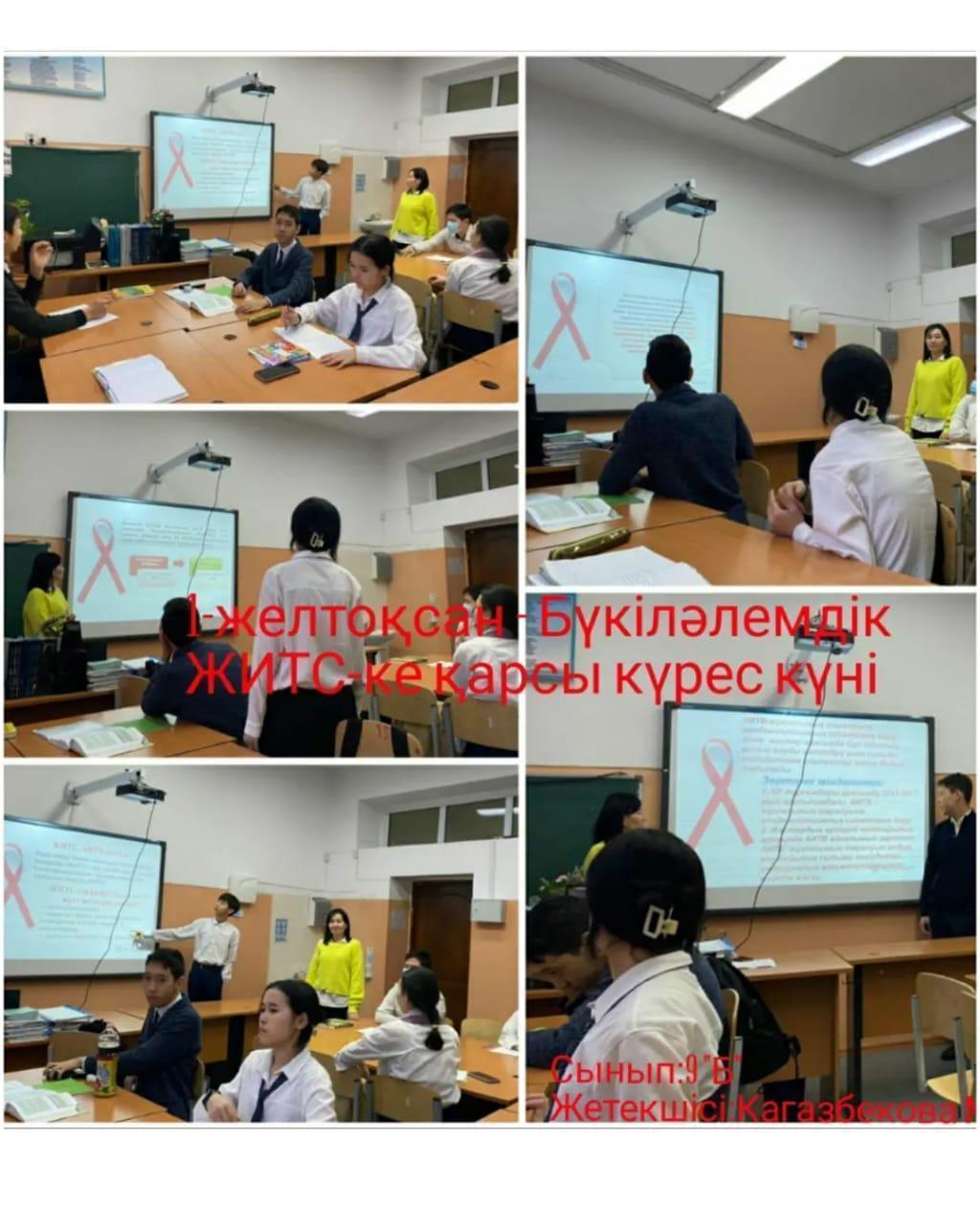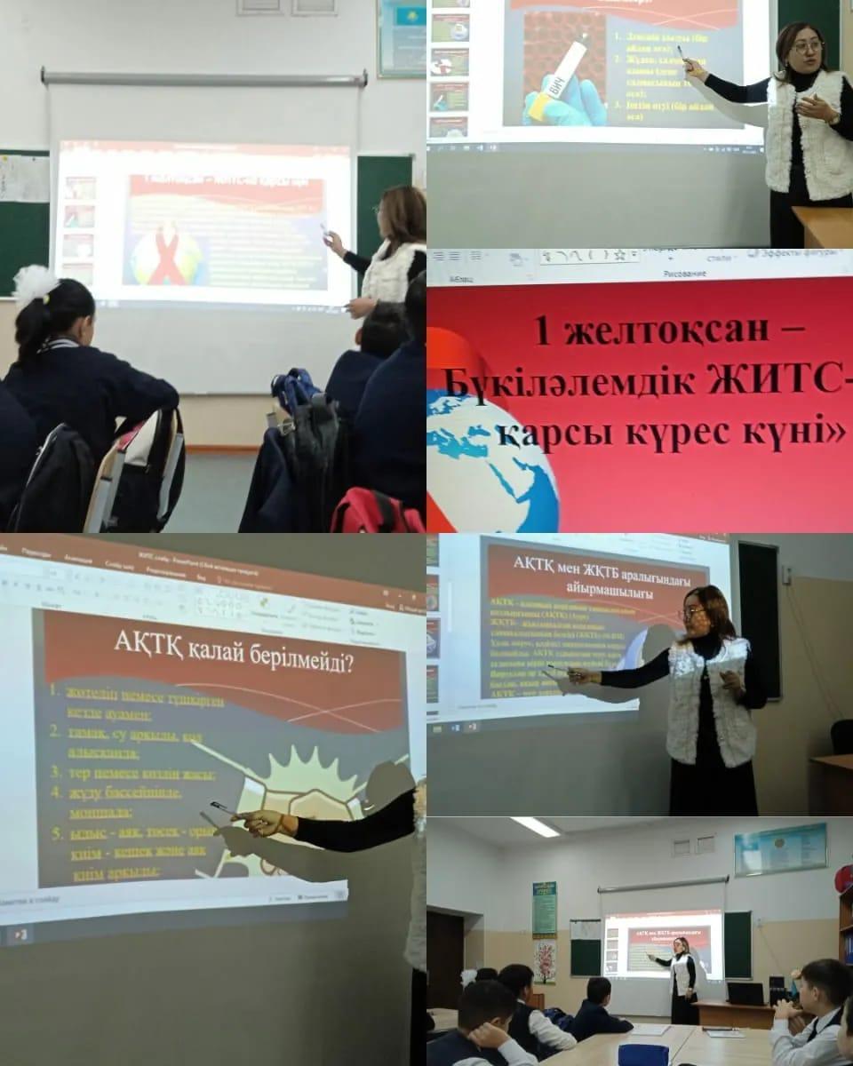 Мектебіміздің 5-11 сынып оқущыларына "ЖИТС - ғасыр індеті" тақырыбында тәрбие сағатты өткізілді. Мақсаты: адамзат өміріне қауіп төндіріп отырған қатерлі ЖИТС дертінің алдын алу, оның жұғу жолдарын, одан сақтану, қорғана білу туралы түсіндіру, салауатты өмір сүруге тәрбиелеу.