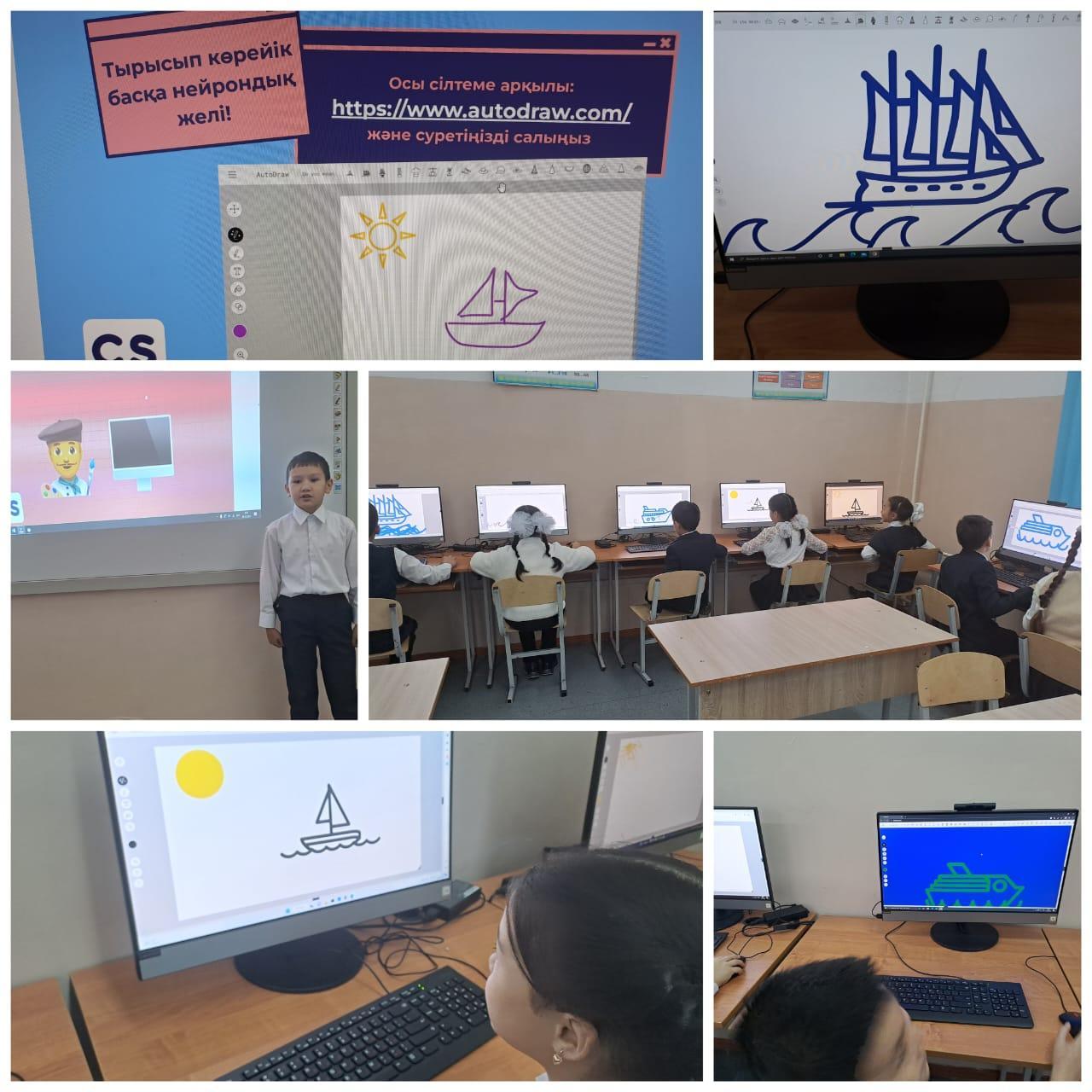 Информатика пәні мұғалімдері Омарова Г.М., Жылғамбаева А.Б. бастауыш сынып оқушыларымен Autodraw нейро желісін пайдалана отырып суреттер салу арқылы компьютердің бейнелерді табу міндетін байқап көрді.