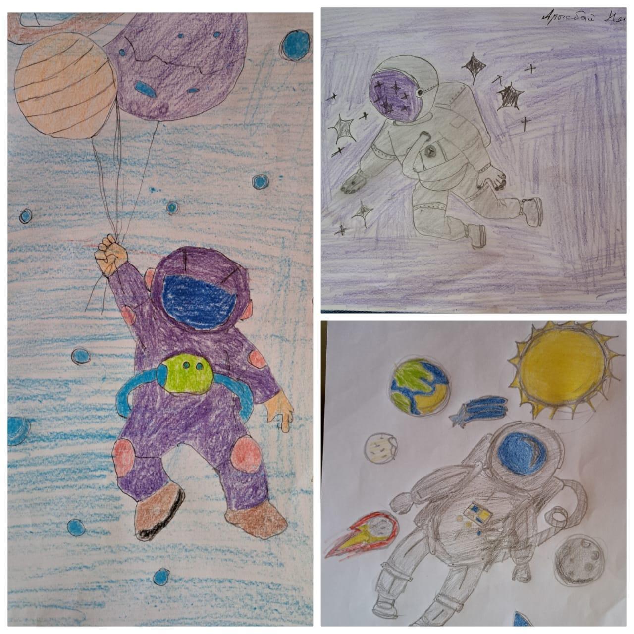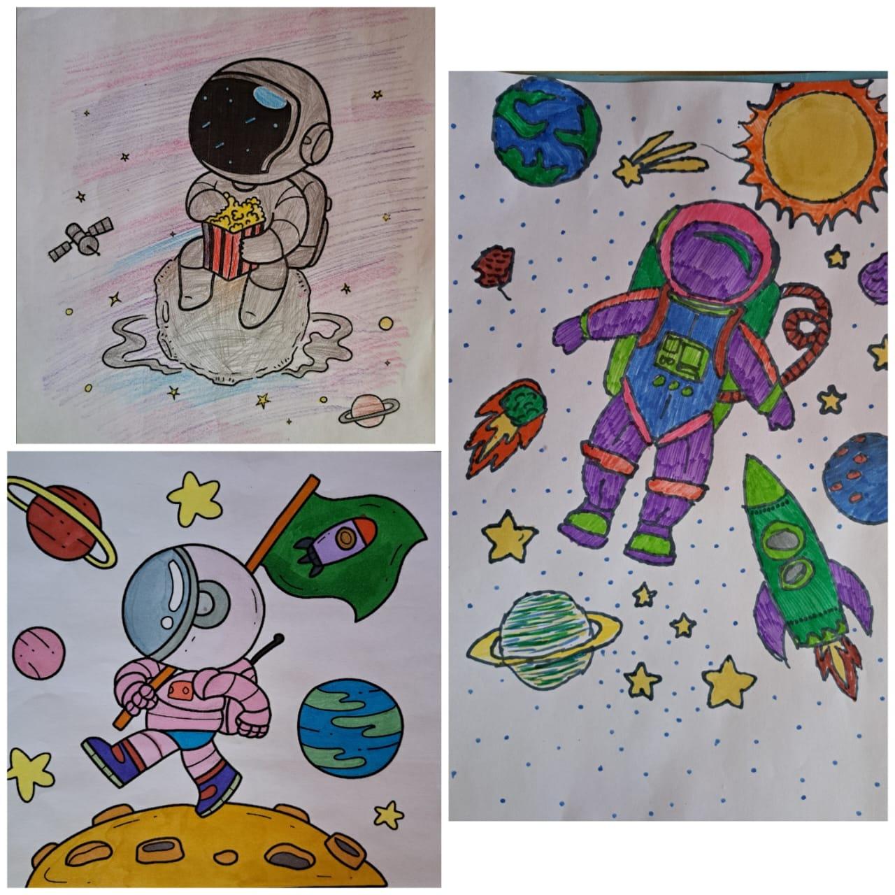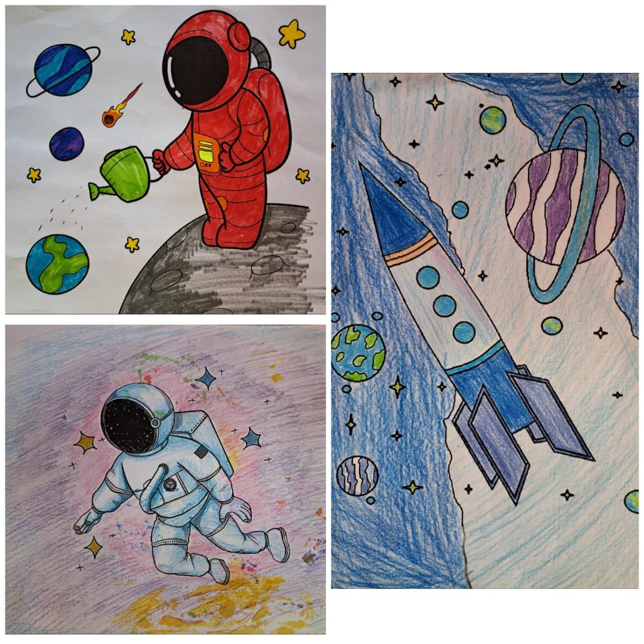 Мектеп оқушыларының "Ғарыш әлеміне саяхат" тақырыбында салған шығармалары.
