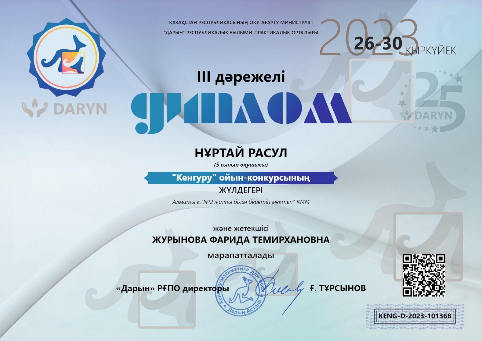 Мектебіміздің 5”А” сынып оқушылары Ерманова Медина, Нуртай Расул және Жаныбекқызы Қорлан “Кенгуру” математикалық ойын-конкурсына қатысып ІІІ дәрежелі дипломмен марапатталды.