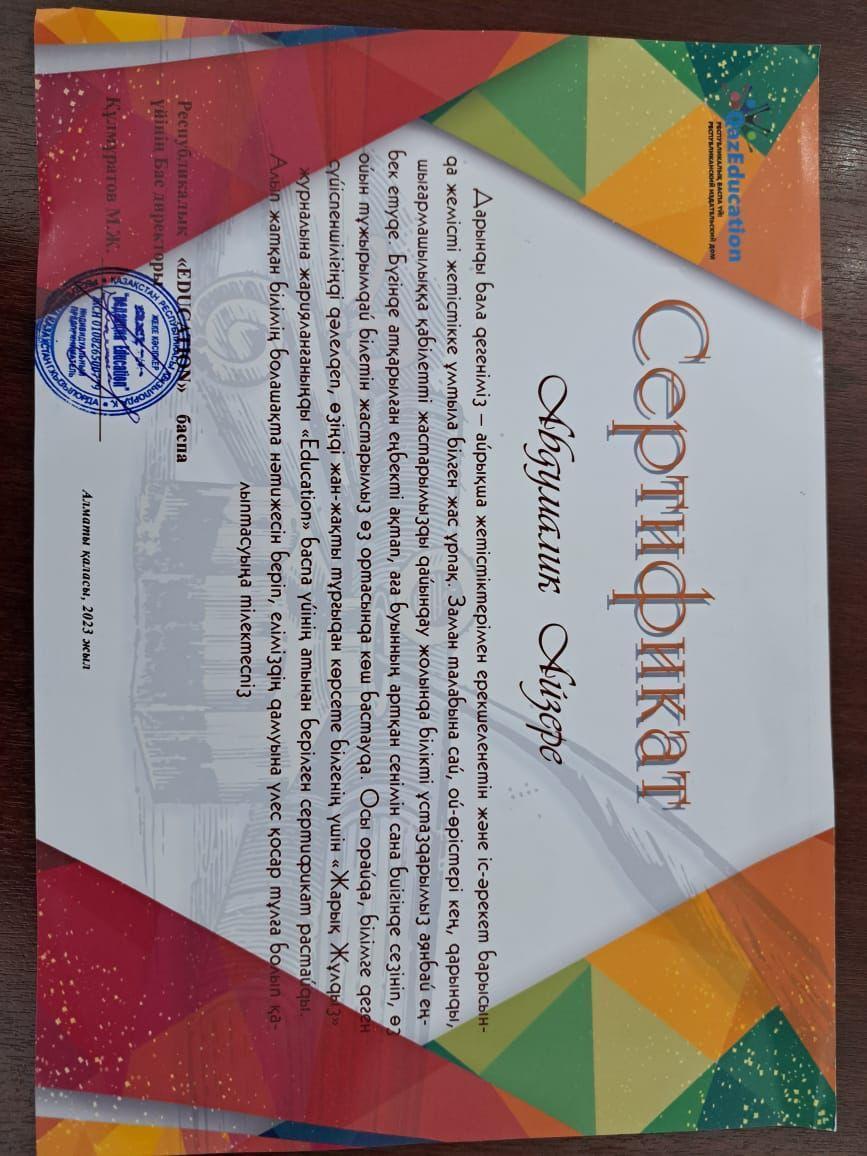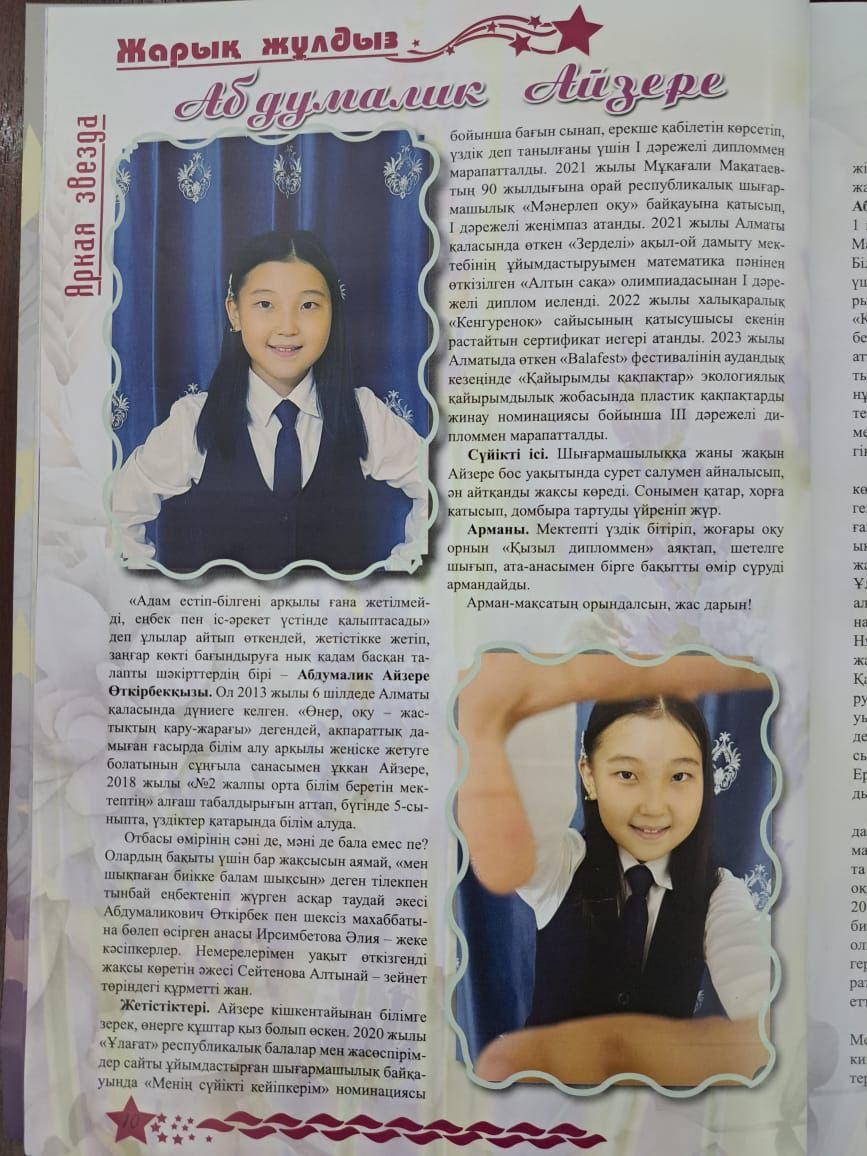 29 қараша 2023 0 1 2 3 4 5 «Жарық жұлдыз» журналы Мектебіміздің 5”А” сынып оқушысы Абдумалик Айзере “Education” баспа үйінің «Жарық жұлдыз» журналына өмірбаяны жарияланып, сертификатқа ие болды. Сынып жетекшісі: Журынова Ф.Т.