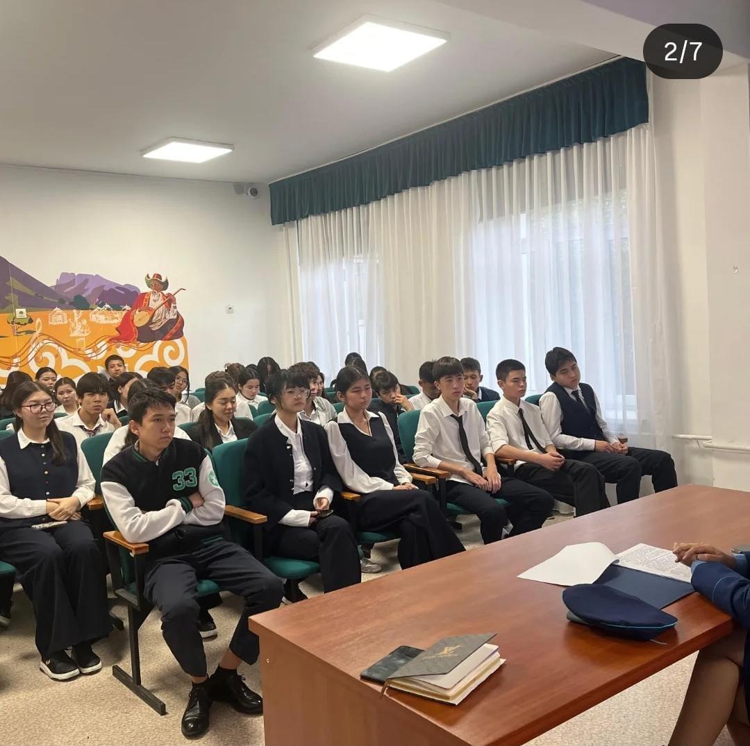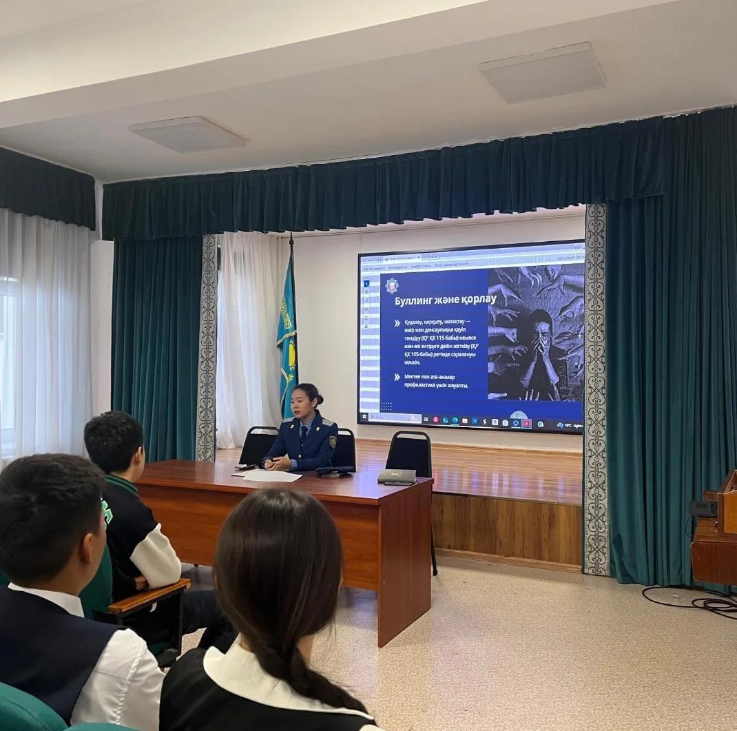 Кездесу барысында оқушыларға құқықтық сауаттылықты арттырудың маңызы, заңды сақтау, құқық бұзушылықтың салдары мен оның болашағына тигізер әсері туралы түсіндірілді. Сонымен қатар, жасөспірімдерді өз құқықтары мен міндеттерін білуге, қоғамда жауапкершілікпен әрекет етуге шақырды.Есірткі заттарын сақтау, тарату және қолдану секілді әрекеттердің қылмыстық жауапкершілікке әкелетінін нақты мысалдармен айтып, оқушыларды құқықтық жауапкершілік пен өз әрекеттеріне деген саналы көзқарасқа шақырды.