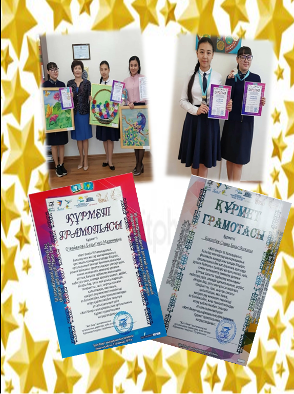 Сонымен қатар конкурсымызға қолдау білдіргені үшін Құрмет грамотасымен мектебіміздің директоры Отепбекова Бакытнур Маденовна және жетекшісі Бақытбек Сания МАРАПАТТАЛАДЫ.