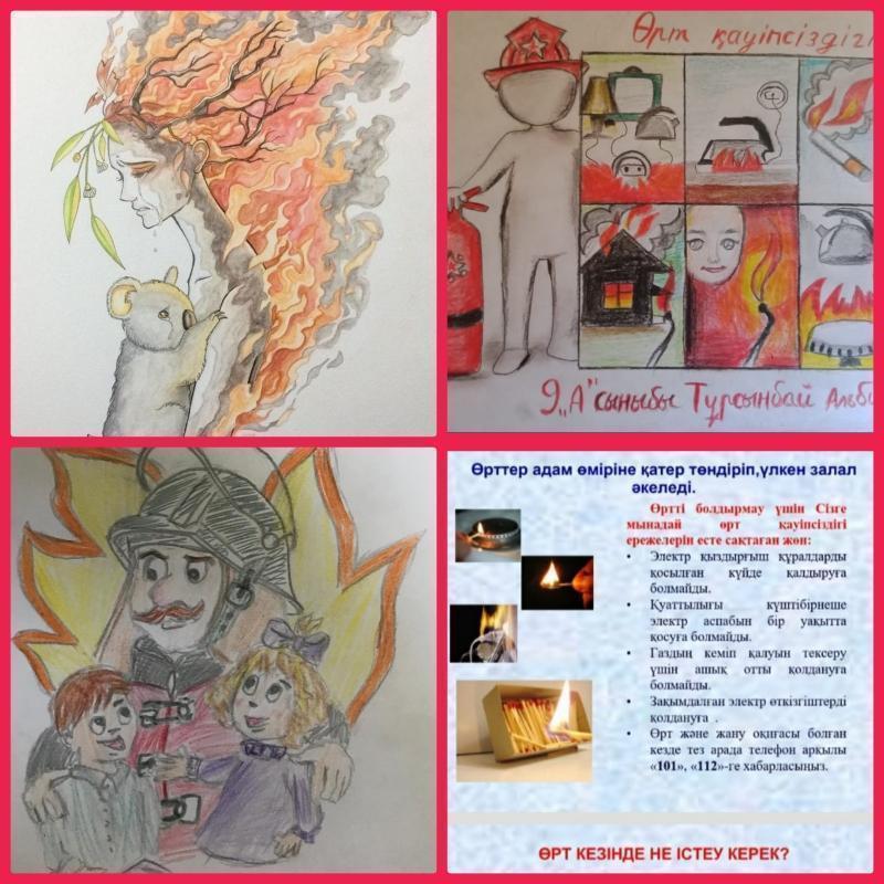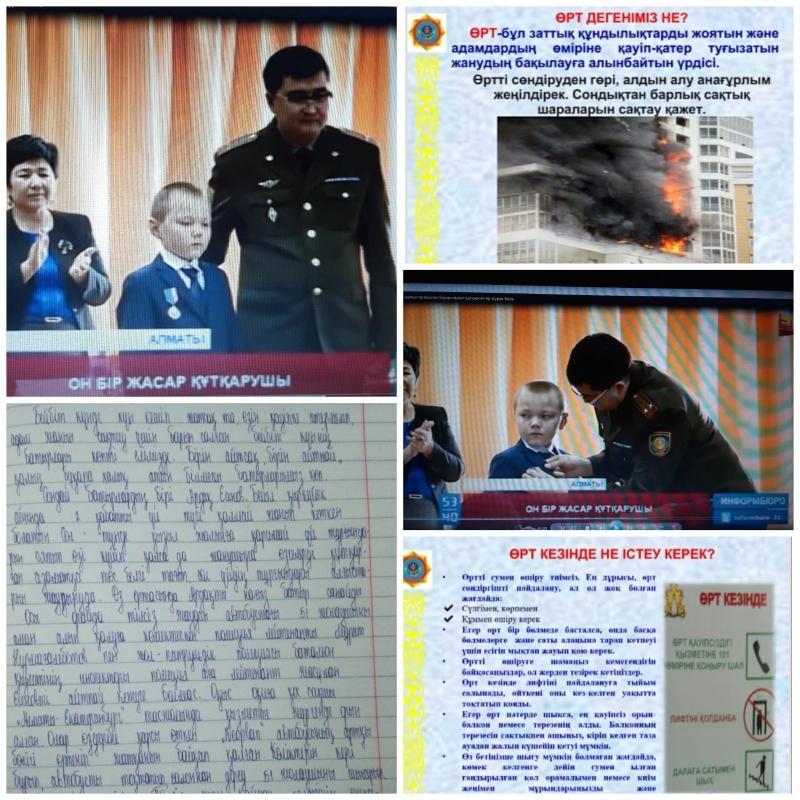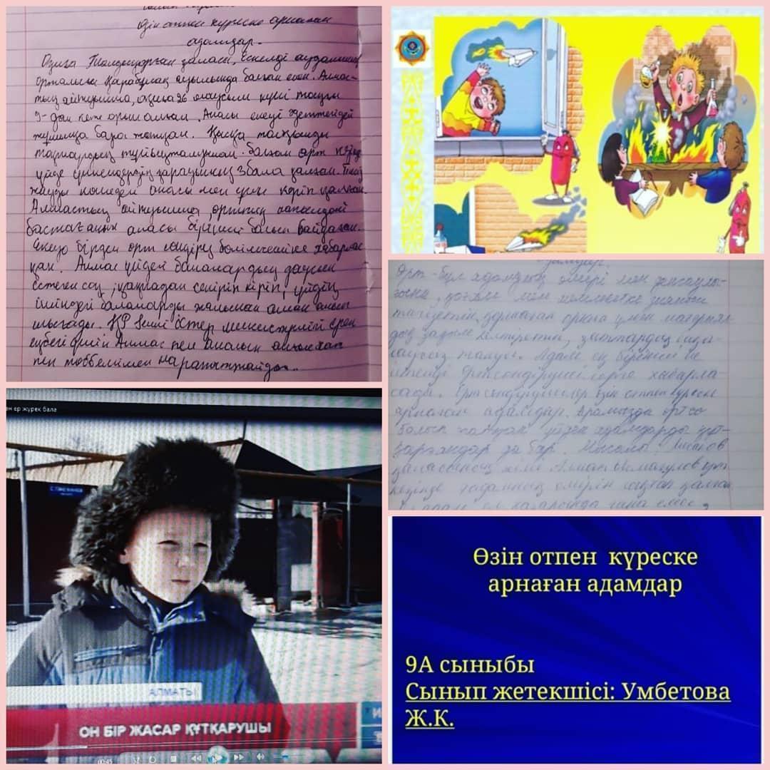 Жетісу ауданы №2 ЖББ мектептің 9 "А" сыныбына "Өзін отпен күреске арнаған адамдар туралы" тақырыбында тәрбие сағаты өткізілді. Мақсаты: Оқушылардың өрт қауіпсіздігі туралы білімдерін толықтып, өрт шыққан жағдайда не істеу керектігін үйрету. Сынып жетекшісі: Умбетова Ж.К