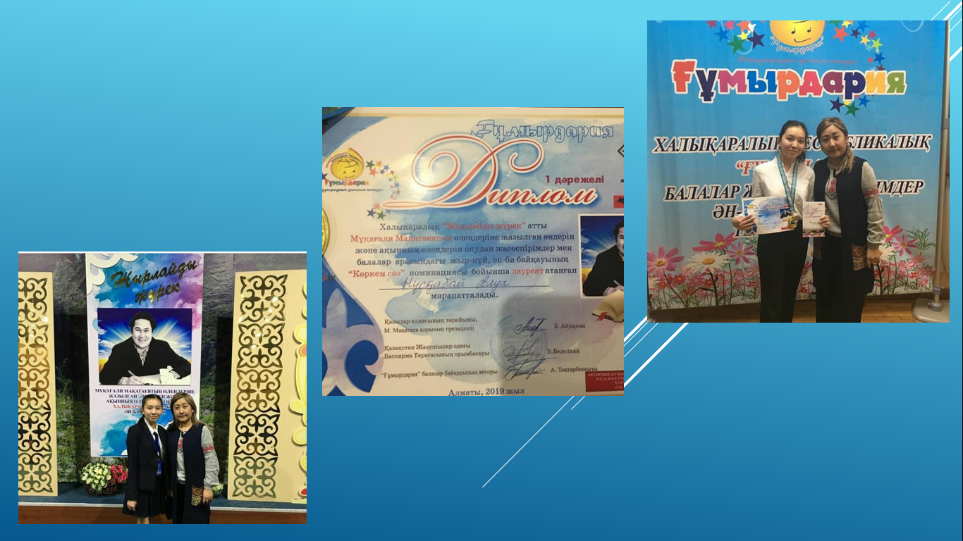 "Ғұмырдария" орталығы ұйымдастырған Халықаралық "Жырлайды жүрек" атты байқауда М.Мақатаевтың өлеңдеріне жазылған әндері мен атанған ақын өлеңдерін оқудан "Көркем сөз" номинациясы бойынша лауреат мектебіміздің мақтанышы 8 "Б" сынып оқушысы Нұсқабай Алуа І-дәрежелі дипломмен марапатталды.
