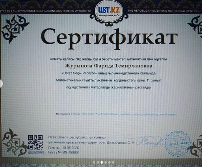 Жетісу ауданы №2 ЖББ мектептің математика пәні мұғалімі Журынова Фарида Темирхановна Білім беру саласының дамуына қосқан қомақты үлесі мен "Ustaz tilegi" Республикалық ғылыми - әдістемелік сайтында оқу-әдістемелік "Математикалық сауаттылық пәнінің қолданыстағы орны", "Параллелограмның ауданы, геометрия пәні", "Біз саналы ұрпақпыз!" материал жариялағаны үшін Құрмет грамотасы және Алғыс хатпен марапатталды!