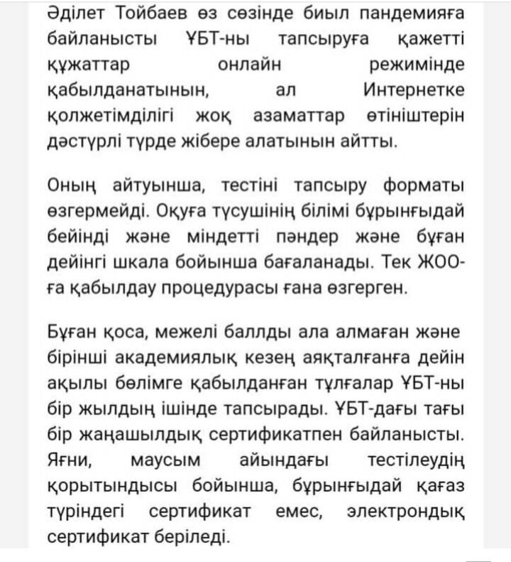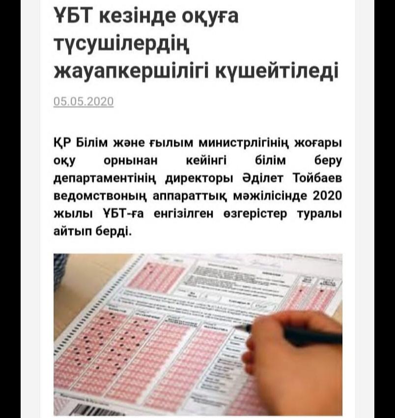 15 мамыр 2020 0 1 2 3 4 5 ҰБТ кезінде оқуға түсушілердің жауапкершілігі күшейтіледі. ҰБТ кезінде оқуға түсушілердің жауапкершілігі күшейтіледі.