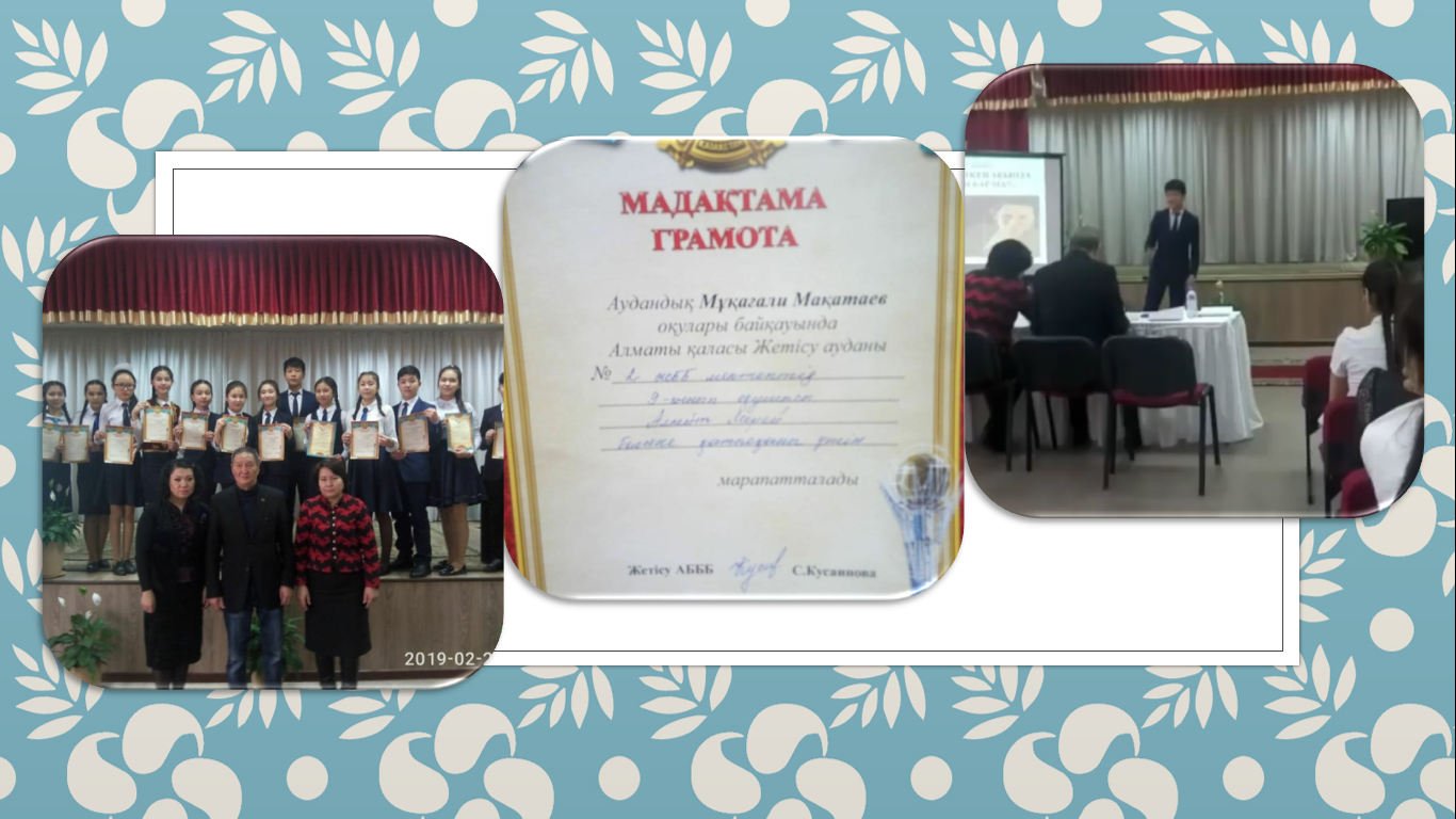 21 ақпан 2019 0 1 2 3 4 5 Мұқағали Мақатаев оқулары Аудандық Мұқағали Мақатаев оқулары байқауында мектебіміздің 9 "Б" сынып оқушысы Алсейт Мерейге белсене қатысып, өзін көрсете білгені үшін алғысымызды айтамыз!